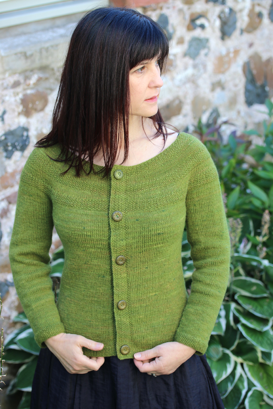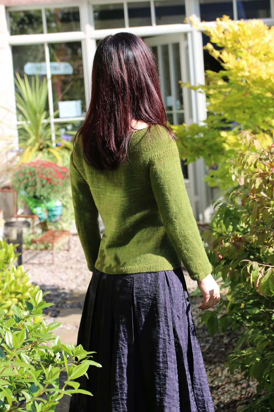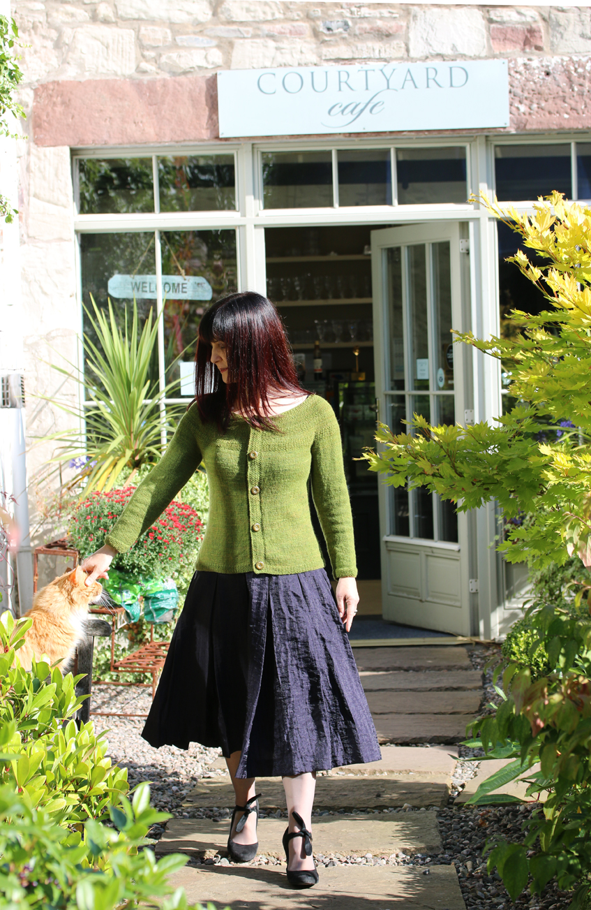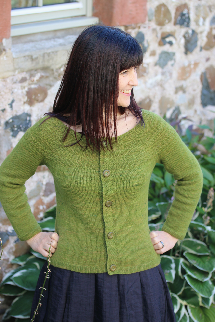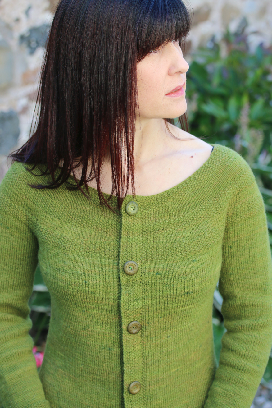 Fintry is a pretty village a short drive away from my home. Though the village nestles against the north face of the rugged Campsie Fells, its direct environs have an unusually gentle feel, with verdant lanes, hedgerows and fields. There is good grazing and growing here, and Fintry’s distinctive pastoral feel provides a stark contrast to the generally rockier, boggier, woodier – much more Highland landscape – which immediately surrounds me. I find this contrast rather interesting. In summer, the landscape around Fintry is extraordinarily green and pleasingly textured – and its those features that I celebrate in this cardigan.