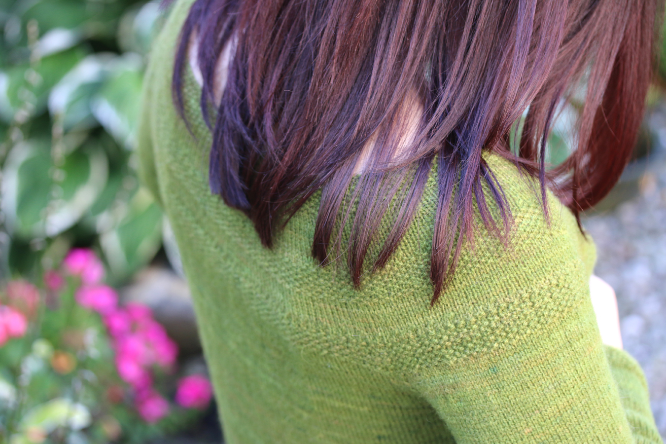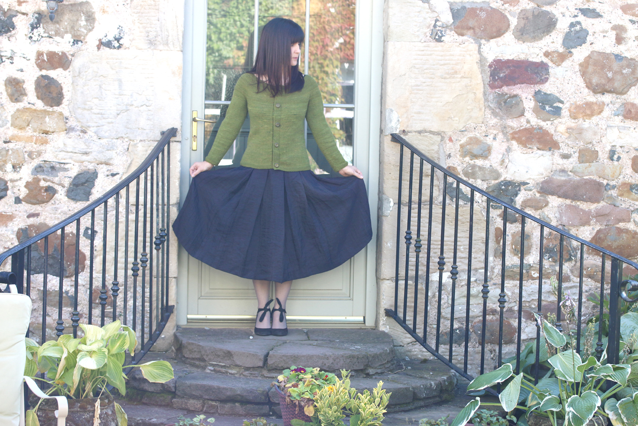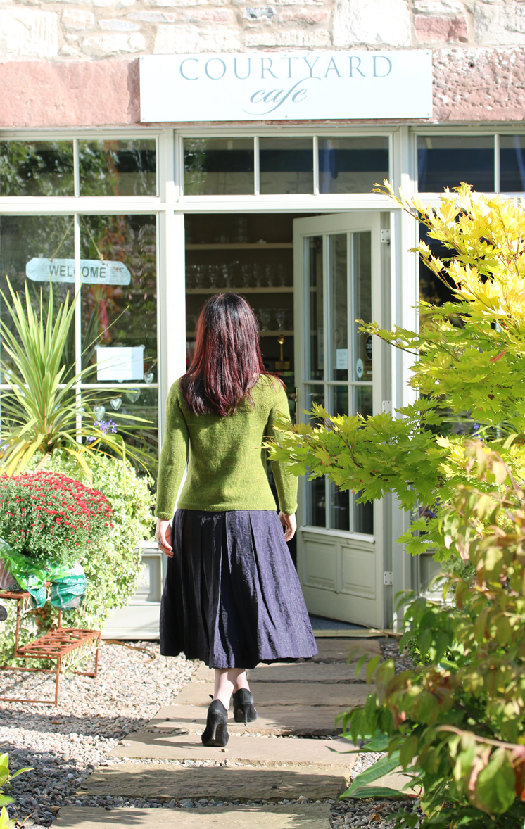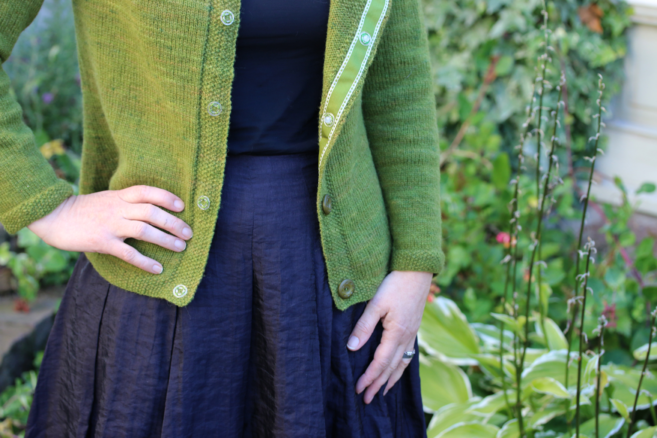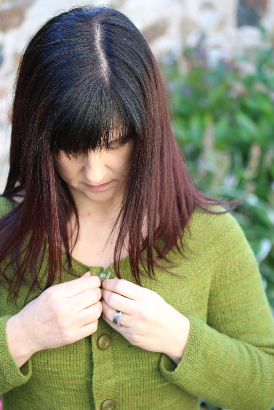 Fintry is a pretty village a short drive away from my home. Though the village nestles against the north face of the rugged Campsie Fells, its direct environs have an unusually gentle feel, with verdant lanes, hedgerows and fields. There is good grazing and growing here, and Fintry’s distinctive pastoral feel provides a stark contrast to the generally rockier, boggier, woodier – much more Highland landscape – which immediately surrounds me. I find this contrast rather interesting. In summer, the landscape around Fintry is extraordinarily green and pleasingly textured – and its those features that I celebrate in this cardigan.