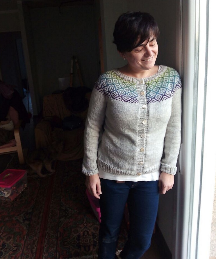 Here is Kristie, in her beautiful Bluebells (which I confess is one of my personal favourites from my Yokes collection) Kristie added some length to both sleeves and body, and omitted some of the waist shaping to make a slightly less fitted garment.