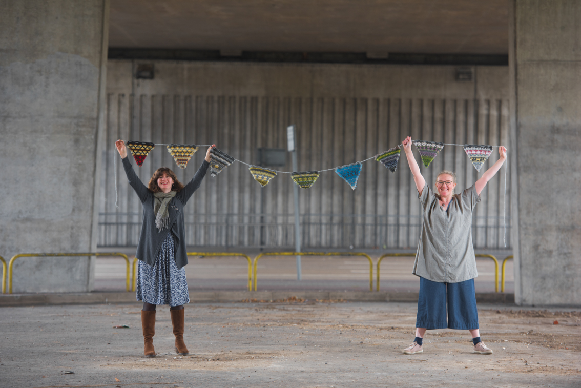 There’s just something about the way their knitted bunting flags transform and celebrate the ordinary spaces of streets and roads, motorways and underpasses, concrete and tarmac. These are environments filled with anonymous signs and injunctions; environments often designed more for cars than bodies; environments which sometimes explicitly exclude different kinds of pedestrian; environments which might frequently be read as unpleasant or even dehumanising.
