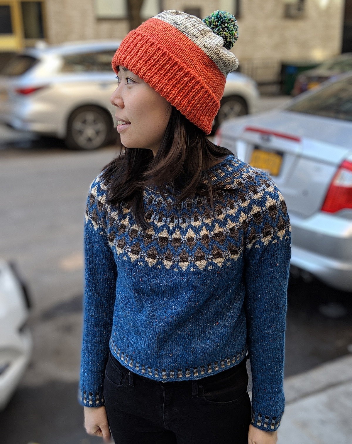 Maylin (blithespirt on Ravelry) mashed up two different KDD patterns–Pabaigh, and the Knitting Season pullover— in a recent Milarrochy Tweed knit. “When the Knitting Season pullover came out, I really liked the motif placement in the centre,” Maylin says, “but I wanted to use it on a garment that I could wear all year round, since every season is knitting season for me. I had the Milarrochy Tweed all ready for a Pabaigh, so decided to incorporate the motif into that pattern centering it right where the split for the arms is, using slip-stitch intarsia for the bottom half and then working back and forth for the top. It works really well as a cozy layering piece for the colder months, and on its own during a rainy, windy UK summer.” It’s definitely the weather for it today, Maylin! I think the intarsia motif looks beautiful on a garment worked at this smaller scale.