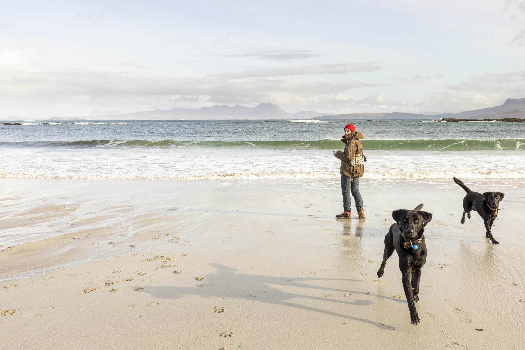 One particularly confusing word which we encountered on this walk was ROUNDHOUSE: a word which made Kate extremely animated, and which she repeated continuously while examining the grassy and sandy location in which Tom is depicted above. Kate kept comparing the radial construction and coastal location of this particular ROUNDHOUSE to other ROUNDHOUSES she’d encountered in North and South Uist, and kneeling to examine large stones while muttering another strange and mysterious word: ORTHOSTAT. Personally, the only thing of interest to me about the ROUNDHOUSE was the large number of rabbits who lived in and around it, none of whom seemed interested in coming out to play, but who I was able to chase enthusiastically.